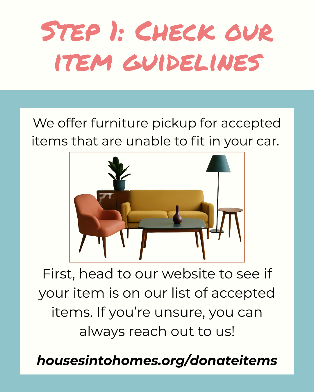 1. Check our item guidelines (housesintohomes.org/donateitems).